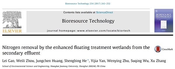 Gao L, Zhou W, Huang J, et al. Nitrogen removal by the enhanced floating treatment wetlands from the secondary effluent[J]. Bioresource Technology, 2017, 234:243-252.doi: 10.1016/j.biortech.2017.03.036