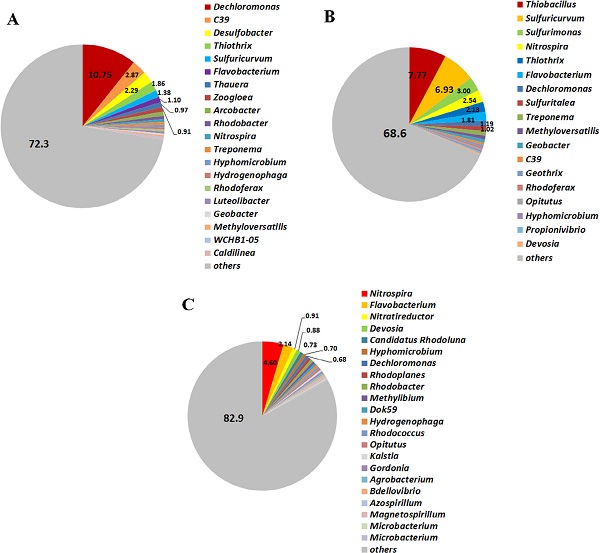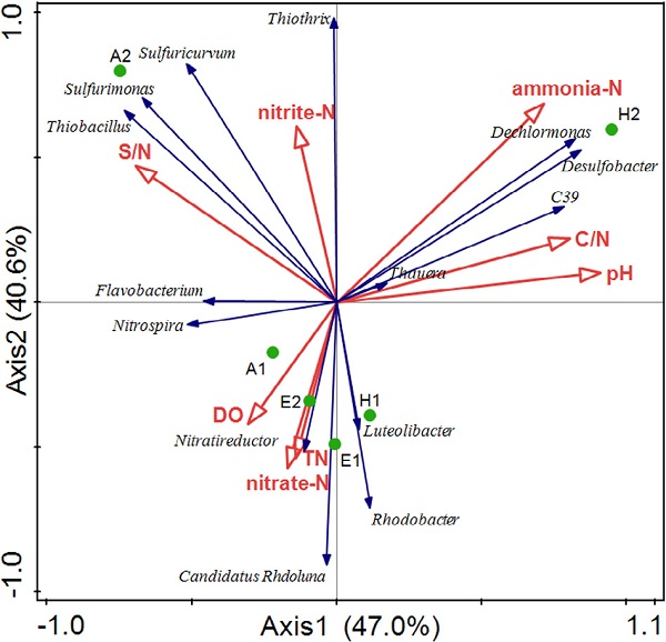 高通量测序结果显示,电子供体诱导微生物结构的明显转变,Dechloromonas、硫杆菌、硝化螺菌属分别成为HEFTW,AEFTW和EFTW样品中最优势的菌。结合RDA分析,揭示了电子供体以及其他环境因子与菌群组成之间的相关性。