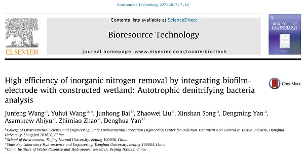 Wang J, Wang Y, Bai J, et al. High efficiency of inorganic nitrogen removal by integrating biofilm-electrode with constructed wetland: Autotrophic denitrifying bacteria analysis.[J]. Bioresource Technology, 2016, 227:7.doi: 10.1016/j.biortech.2016.12.046