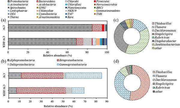 对CW和CW-BER阴极生物膜和与生物膜同高度的石英砂样本进行高通量测序,结果如下: