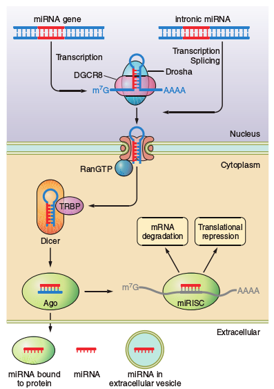 miRNA标志性功能是通过碱基互补配对结合靶基因来抑制基因表达的能力,通过识别并结合靶基因,改变mRNA的比例来调节RNA的表达。miRNA与RNA结合不仅对RNA产生影响,对关联的miRISC效应蛋白也产生影响。除了基因调节的传统功能,也有证据证明他们以其他功能出现在不寻常的地方。比如miRNA能通过结合各自的核糖核蛋白复合物诱导靶基因翻译。