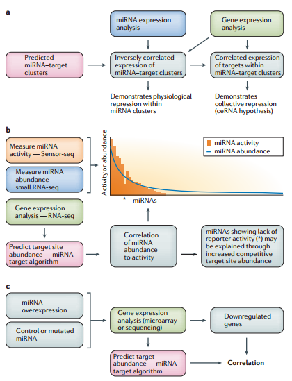 自该假说提出以来,有大量的研究结果为它提供了支持,但是也引发了一些质疑。在该综述中,作者们评估了支持和反对ceRNA假说的一些证据,以及内源性miRNA海绵(miRNA sponge)互相作用的影响。如环状RNAcIRS‑7(也叫做CDR1‑AS) 可调控中枢神经系统中miR-7的活性;cir‑ITCH可通过海绵作用吸附miR-7, miR-17 和 miR-214,从而调控食管鳞状上皮癌细胞(ESCC)中泛素蛋白连接酶E3(ITCH)的表达。此外,研究者还发现病毒核小RNA(snRNA)也具有miRNA海绵作用,如疱疹病毒产生的尿嘧啶富集的snRNA,它们具有大量的宿主miRNAs(miR-16, miR-27a and miR-142-3p)结合位点。