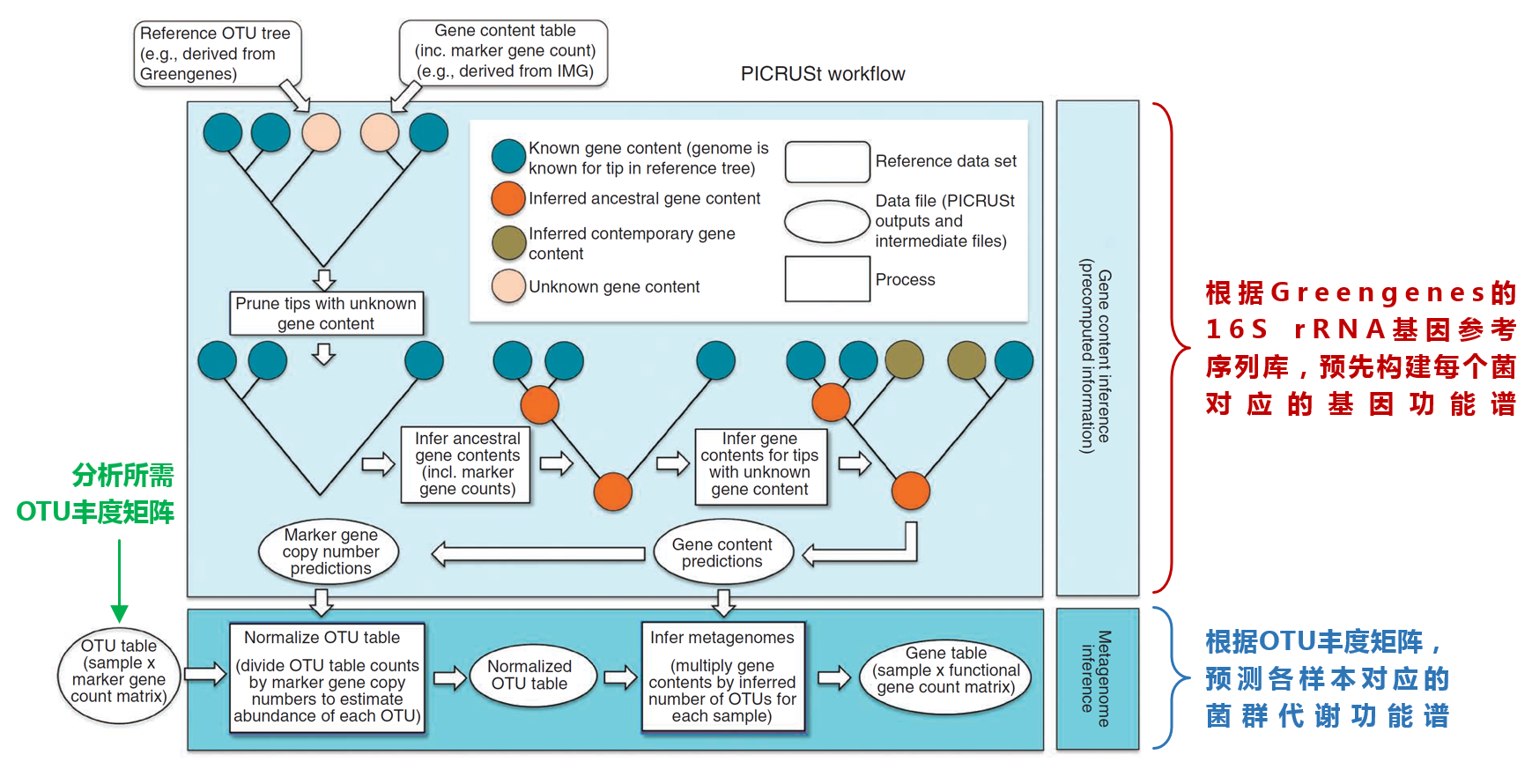 由此,一款名为PICRUSt的菌群代谢功能预测利器应运而生,相关论文发表在权威期刊《Nature Biotechnology》上[1]。PICRUSt全称为“Phylogenetic Investigation of Communities by Reconstruction of Unobserved States”,可以通过16S rRNA基因序列,预测对应的细菌和古菌的代谢功能谱。