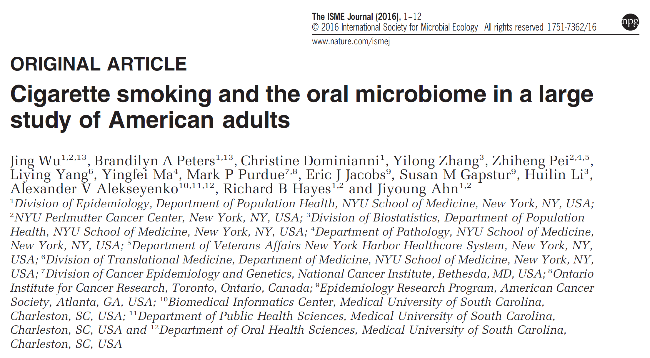 2. Wu J, Peters BA, Dominianni C, Zhang Y, Pei Z, et al. (2016) Cigarette smoking and the oral microbiome in a large study of American adults. ISME J 10.1038/ismej.2016.37.