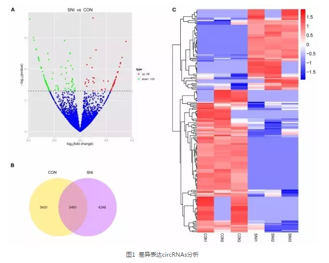 术后14天的SNI组大鼠L4−5 脊髓相较于CON组,共鉴定出144 个差异表达(DE) lncRNAs (15个上调,129个下调),188个 DE circRNAs(68个上调,120个下调),12个 DE miRNAs (6 个上调,6 个下调) 。1066个DE mRNAs(531个上调,535个下调)。分别预测DE lncRNAs,circRNAs,miRNAs的靶基因。