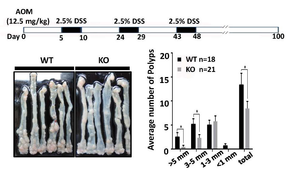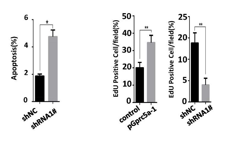 敲除GPRC5A会抑制结直肠癌细胞增殖和群体形成,但是会促进细胞凋亡。GPRC5A的高表达与结直肠癌肿瘤的恶性程度成正相关并且可以通过抑制氧化应激的过程来阻止人或小鼠模型中结直肠癌的过程。