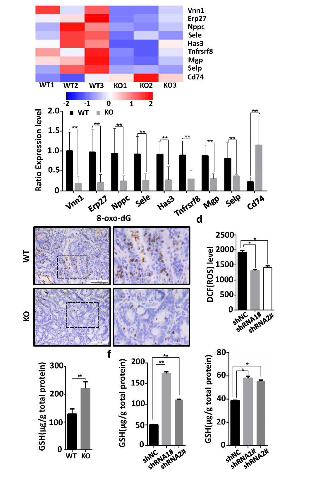 利用转录组高通量测序技术发现了大量氧化应激相关基因的特异性表达,例如NPPC、NAC、Selp、Sele和Erp27等。图4d-f中所展示的GSH水平增加以及ROS减少表明,敲除GPRC5A的癌细胞中靶基因异常表达,从而证明该组织中氧化应激减少。利用转录组测序发现的相关基因都是氧化应激基因应答的下游基因,推测Vnn1是GPRC5A基因表达的主要下游基因。GPRC5A缺陷的细胞和小鼠组织,相关基因和蛋白质水平下调。综上所述,GPRC5A通过调节VNN1水平抑制细胞氧化还原状态。