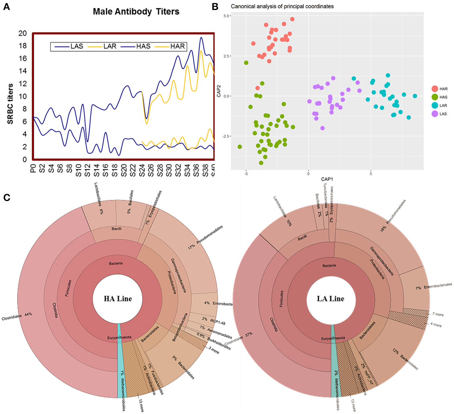 经长期宿主抗体差异选择,高抗组与低抗组在肠道菌群组成中表现出明显的差异;其中图A为经传代培养的严格与非严格选育的高抗组与抵抗组样品变化趋势;图B中通过CAP主坐标典型相关分析可以看出4个处理组中肠道菌群组成存在显著差异;图C中分别显示的是高抗组与抵抗组中主要存在的优势菌群。