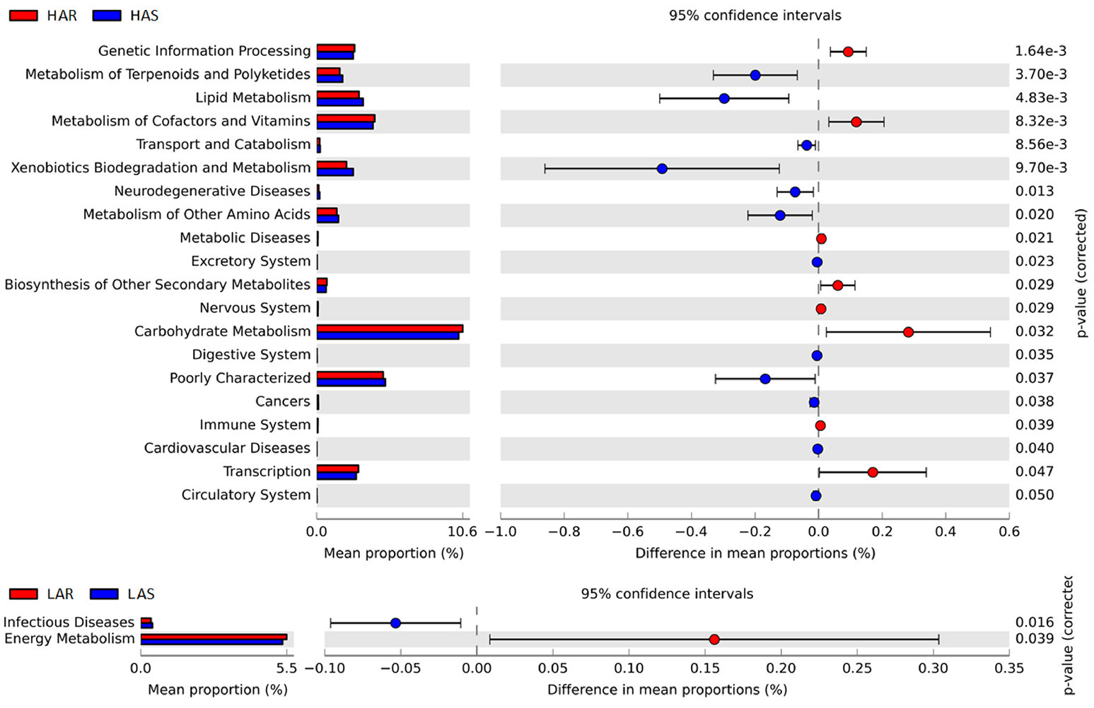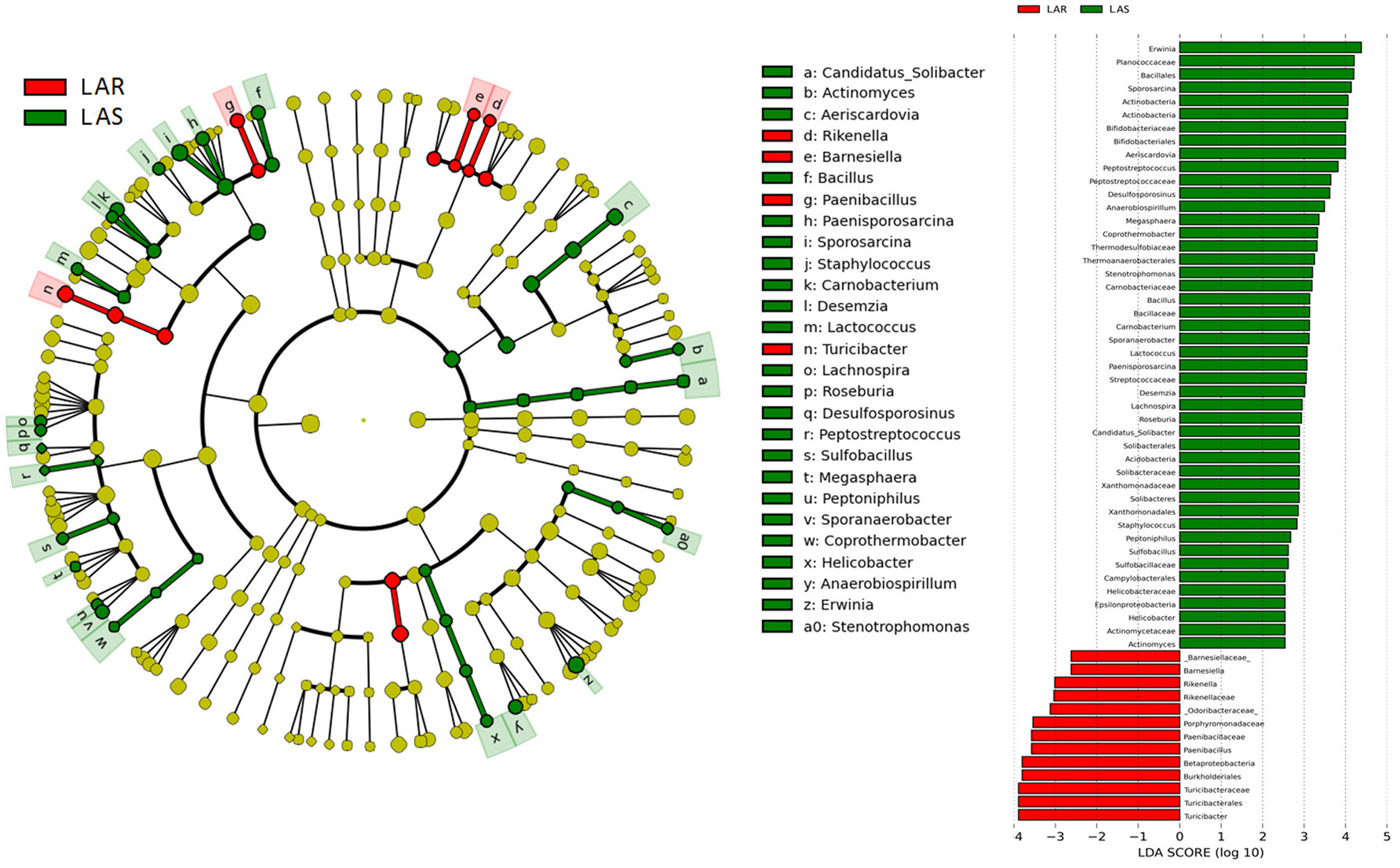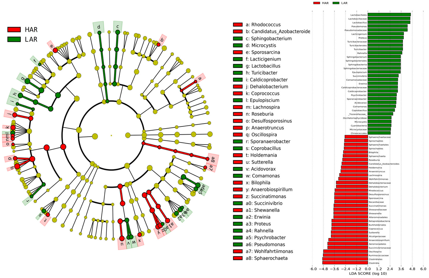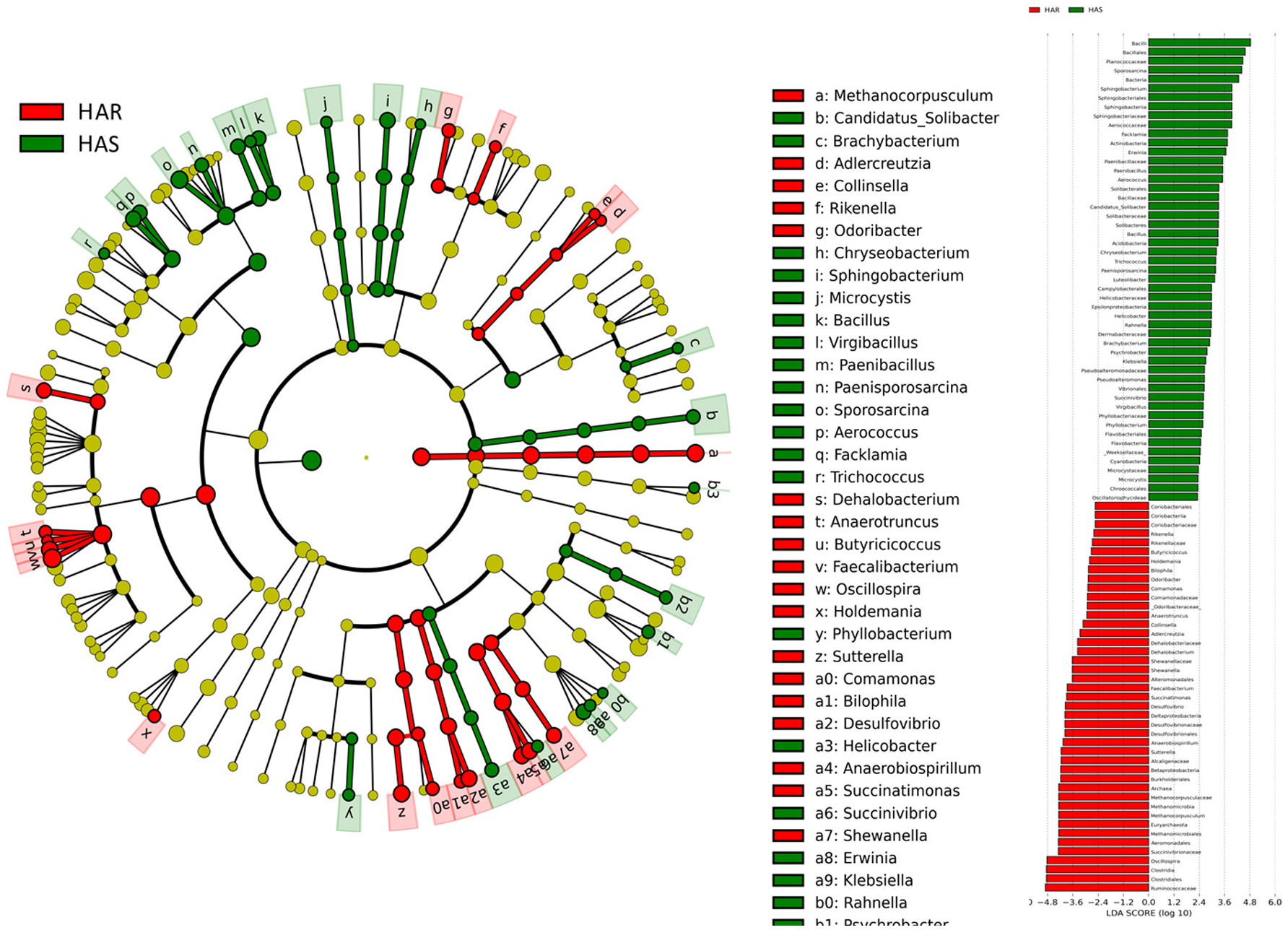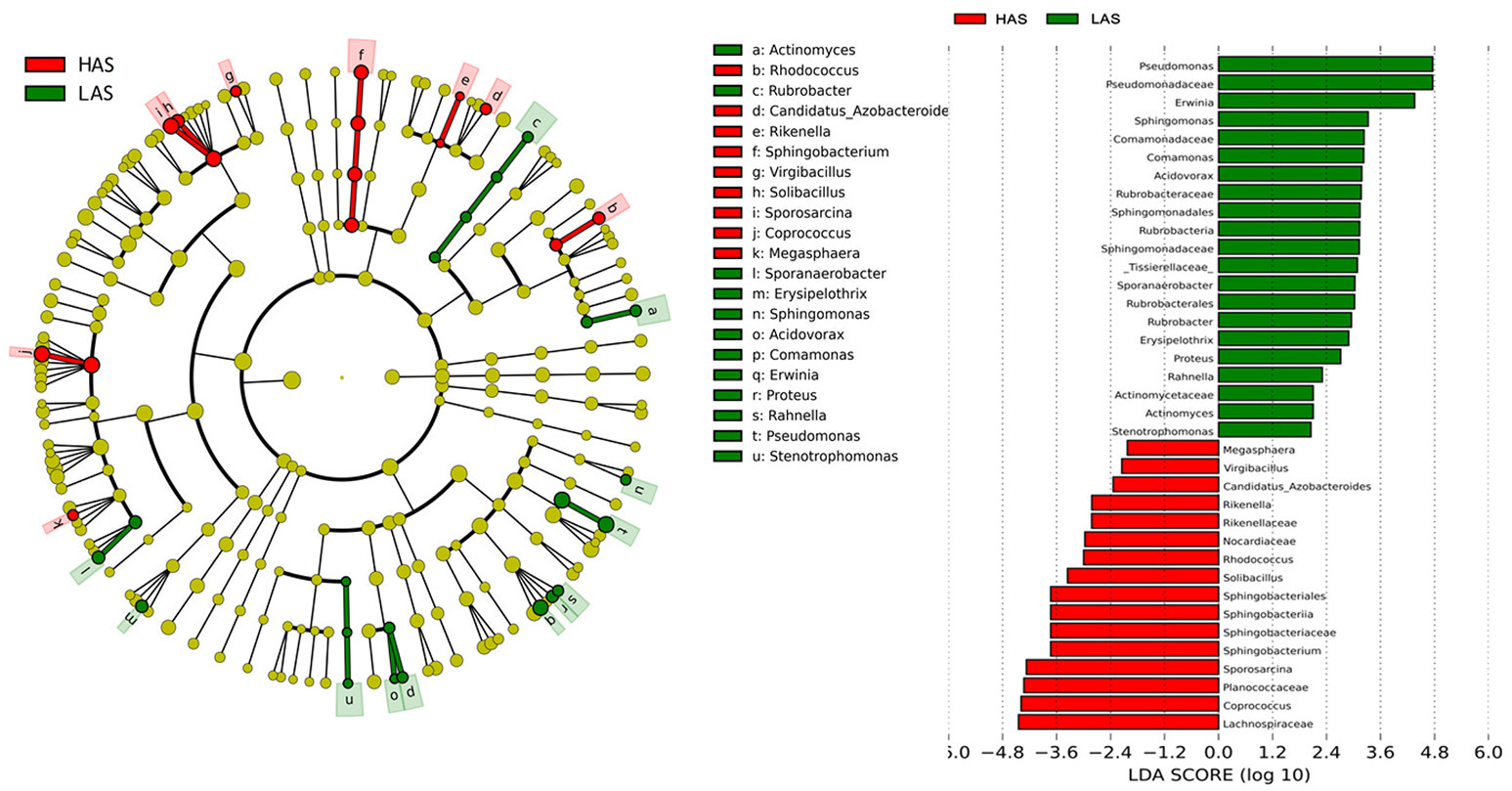 LEfSe分析分别显示其高抗组与抵抗组中的严格选育及非严格选育间的显著差异菌群,其中门水平中有8个物种在HAS与HAR组中显著差异,但仅有一个物种在LAS与LAR组中存在显著差异;属水平中39个物种在HAS与HAR组中存在显著差异,27个物种在LAS与LAR组中存在显著差异。