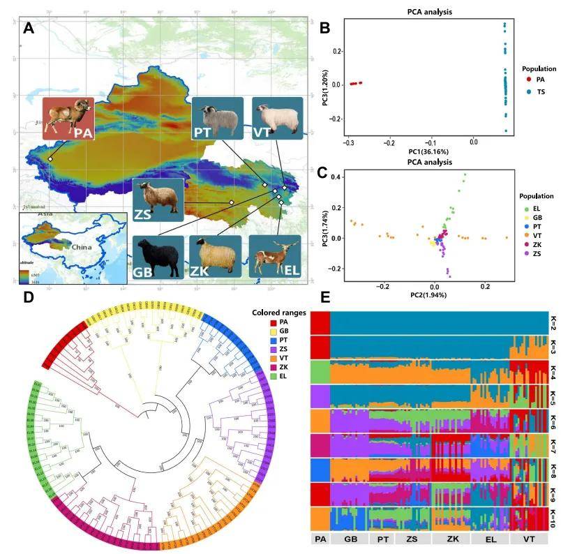 本研究共有130只绵羊,其中6个不同品种(EL,GB,PT,VT,ZS,ZK)的120只藏绵羊,10只盘羊的测序数据来自NCBI(图1A)。
