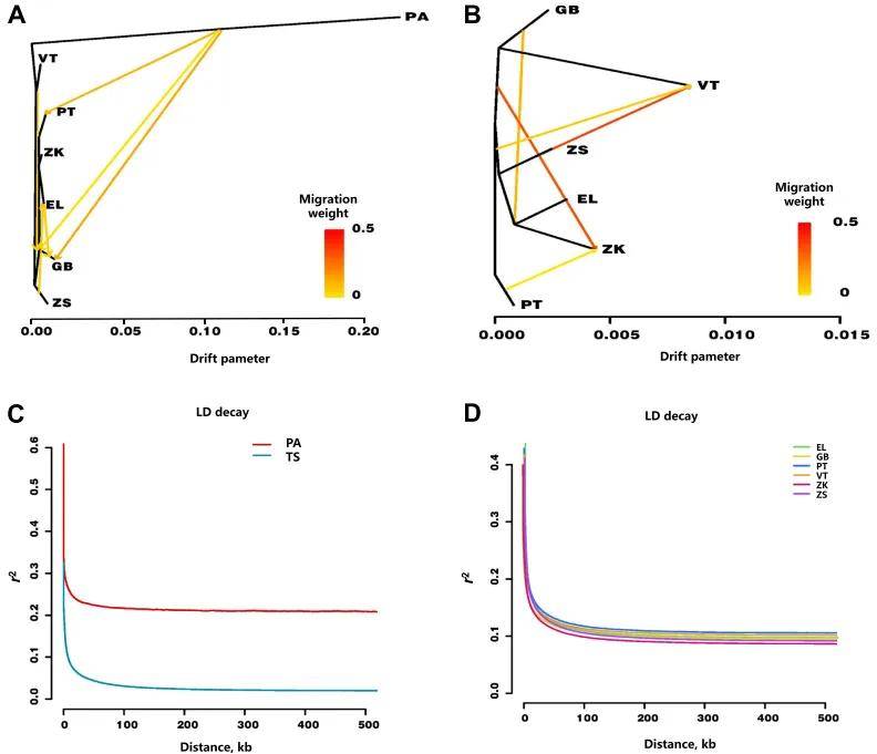 从两个方面分析了LD衰变:第一,将6个藏绵羊品种作为一个整体(TS)与盘羊进行比较,表明TS的LD速度比盘羊快;第二,仅关注6个藏绵羊品种,结果表明PT亚型表现出最慢的衰变率,而ZK亚型最快。说明ZK种群经历了最高程度的驯化和最激烈的人工选择,而PT亚型表现出最高的群体多样性和最低的人工选择强度(图2C和D)。