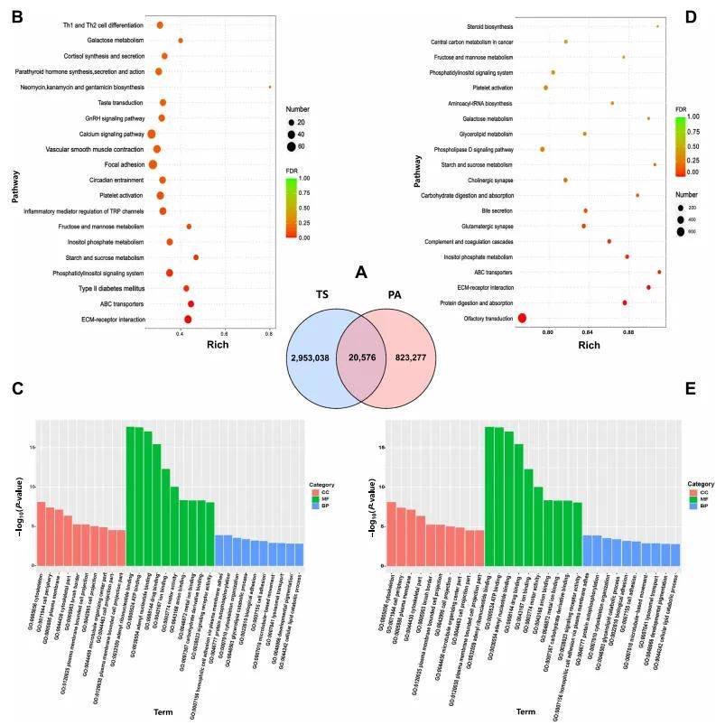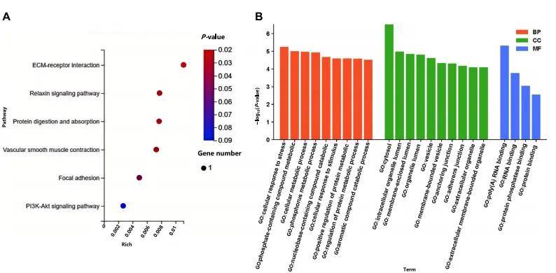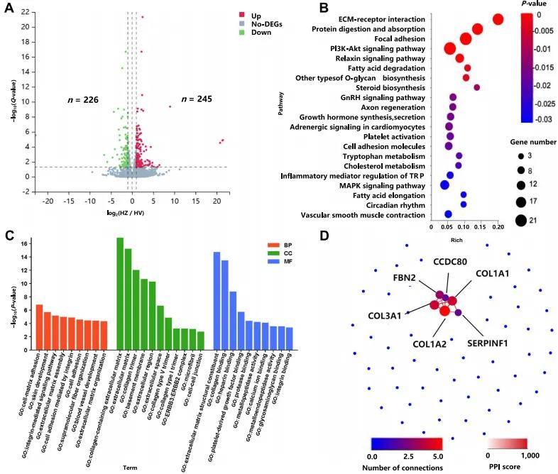在ZS与VT的比较中,五个基因(RAMP1、PTPN3、COL4A2、MXRA5和ADAMTS2)受到了选择,并在心脏和肺转录分析中差异表达。这些基因是适应高海拔的潜在候选基因。KEGG和GO(图7A和7B)富集分析揭示了这些途径可能代表了藏绵羊适应高海拔高原环境的关键调控机制。