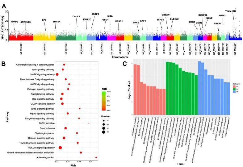 6个藏绵羊品种与盘羊通过XR-CLR鉴定藏绵羊在驯化过程中经历自然选择和人工驯化的基因组区域,并对受选择信号进行富集分析(图4A),结果显示KEGG通路分析强调了参与信号转导的通路,包括Ras信号通路、PI3K/Akt等信号通路和钙信号通路。GO分析揭示了对发育和细胞功能至关重要的过程(图4B和4C)。