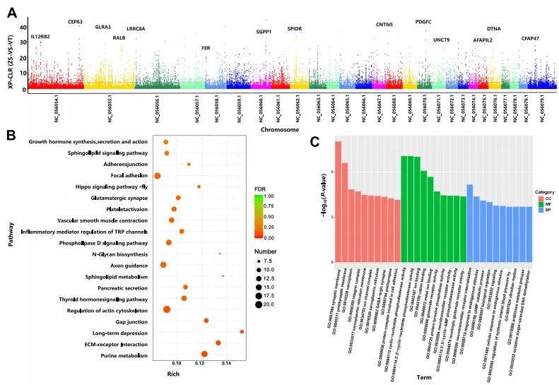 青藏高海拔地区(4300米)的ZS与自低山谷地区(1800米)的VT,经过XP-CLR鉴定出5788个受选择区域(图5A)。KEGG显著富集于嘌呤代谢、ECM受体相互作用、血管平滑肌收缩、甲状腺激素信号等通路途径(图5B)。GO富集分析揭示了与适应相关的过程(图5C)。