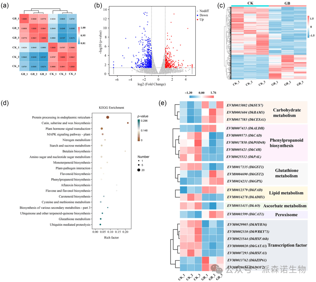 (a.样本相关性;b.差异火山图;c. DEG聚类热图;d.KEGG富集分析;e.差异转录组因子热图)