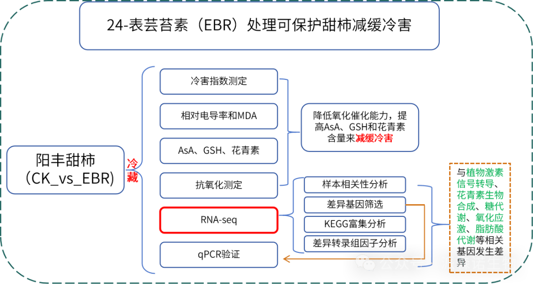 文章要点:EBR处理通过降低MDA含量和电解质相对渗漏率,降低ROS积累水平,提高AsA、GSH和花青素含量来缓解阳丰甜柿冷害。EBR处理同时还提高了PAL活性,降低了POD和PPO活性水平。此外,通过转录组测序结果显示,EBR处理改变了与植物激素信号转导、花色素苷生物合成、油菜素类固醇生物合成、糖代谢、苯丙素类生物合成、氧化应激和脂肪酸代谢等相关基因的表达水平