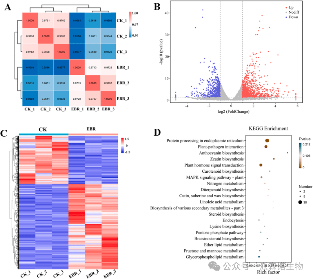 (A.样本相关性;B.差异火山图;C. DEG聚类热图;D.KEGG富集分析)