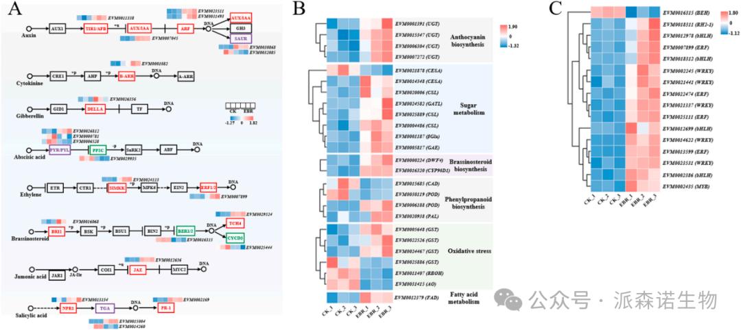 (A.通路热图;B.转录因子热图;C.抗寒基因热图)