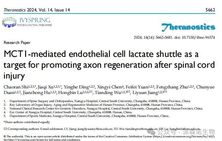 2024年9月,中南大学湘雅医院的研究团队在Theranostics(最新 IF: 13.3/Q1)上发表“MCT1-mediated endothelial cell lactate shuttle as a target for promoting axon regeneration after spinal cord injury”的研究论文。该研究通过整合能量代谢组学分析和实时乳酸动态监测技术,首次揭示内皮细胞特异性MCT1表达缺失引发的乳酸代谢轴功能紊乱是脊髓损伤后轴突再生障碍的关键病理机制。此外,通过AAV介导的MCT1基因治疗,证实其过表达可以显著促进轴突再生并改善运动功能恢复。这一效应可能与乳酸代谢轴的重建及神经元能量供应的改善有关。派森诺生物提供靶向能量代谢组学分析服务。