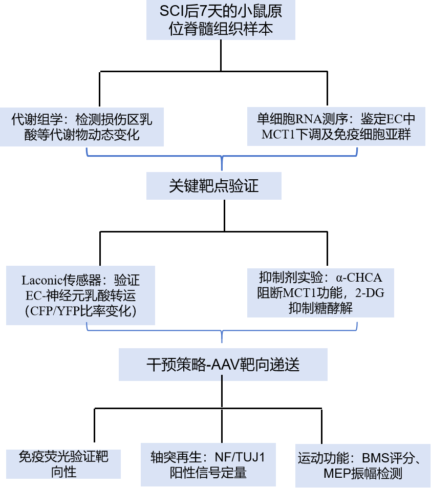 本研究本通过整合靶向代谢组学、单细胞RNA测序、基于FRET的乳酸传感器(Laconic)技术及AAV靶向递送系统,揭示了SCI后EC中MCT1介导的乳酸代谢轴断裂机制:SCI导致损伤区乳酸积累,但EC中MCT1表达下调阻碍了乳酸向神经元的转运,引发神经元能量危机并抑制轴突再生。通过AAV靶向恢复EC的MCT1表达,可促进乳酸穿梭、增强神经元糖酵解活性(HK1/PFKM/PKM1上调),进而驱动轴突再生(NF/TUJ1阳性信号增加)和运动功能恢复(BMS评分提升),为SCI治疗提供了代谢干预新策略。