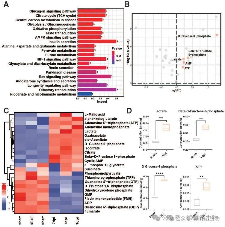 锁定关键代谢分子:研究人员通过靶向能量代谢组学分析发现,SCI后7天的小鼠模型中,糖酵解代谢显著增强,表现为乳酸、D-葡萄糖-6-磷酸、β-D-果糖-6-磷酸等关键代谢物水平显著升高(图1A-B),且KEGG通路分析证实糖酵解途径的代谢物整体上调(图1C)。乳酸作为糖酵解核心产物被确定为SCI后的关键代谢分子,为后续研究提供了重要方向。