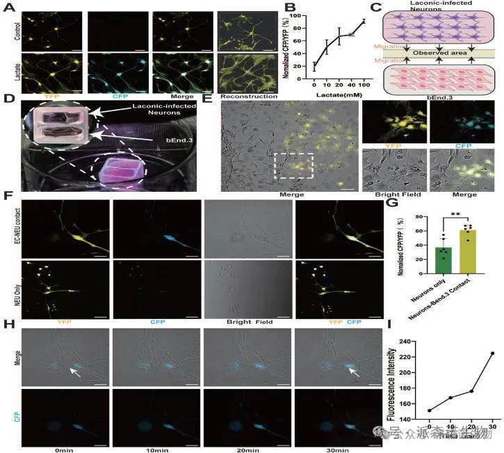 作用机制探索:通过基于FRET的乳酸传感器(Laconic)证实,ECs与神经元间的直接接触依赖的乳酸转运机制。实验显示,乳酸浓度升高(10-100 mM)可剂量依赖性增加CFP/YFP荧光比值,而共培养体系中,仅与ECs直接接触的神经元或CATH.a细胞表现出荧光比值升高,延时成像进一步验证了乳酸通过细胞接触从ECs向神经元的动态转移。这一发现揭示了ECs来源的乳酸通过物理接触直接支持神经元能量代谢的生物学作用。