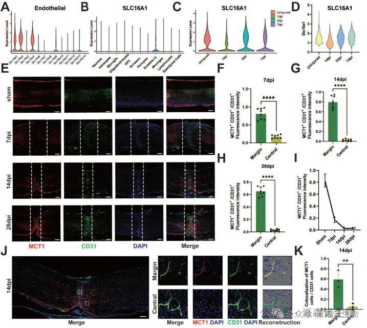 作用机制探索:进一步研究发现,SCI后,尽管损伤中心区域乳酸水平升高,但新形成的血管内皮细胞中单羧酸转运蛋白1(MCT1/SLC16a1)表达显著降低,导致乳酸转运机制缺陷。单细胞数据分析及免疫荧光显示,MCT1在正常脊髓内皮细胞中高表达且与CD31共定位,但损伤后7-28天的新生血管中MCT1缺失,仅周围区域表达升高(部分与GFAP共染)。这表明SCI后内皮细胞功能受损,MCT1介导的乳酸-神经元穿梭中断,可能加剧代谢失衡。