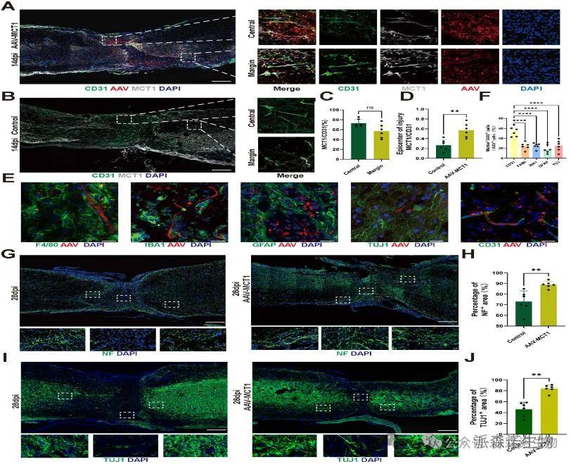 功能验证:通过腺相关病毒(AAV-MCT1)靶向恢复脊髓ECs中MCT1的表达,可显著促进SCI小鼠的轴突再生和功能恢复。实验显示,AAV-MCT1在血管ECs中特异性表达(与巨噬细胞、胶质细胞无共定位),并增强损伤核心边缘的神经丝蛋白(NF)和β-Tubulin III(TUJ1)阳性轴突再生,证实MCT1介导的乳酸穿梭对修复SCI后神经功能具有关键作用。