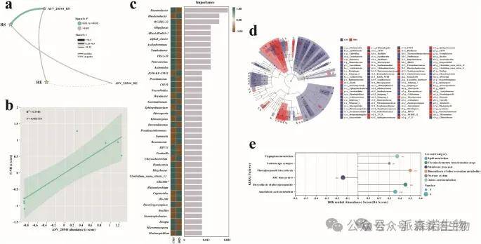 ASV_20544的序列与菌株NCT-2的序列完全一致,并主要定殖在接种菌株NCT-2的S. nigrum根际土壤和根内生境中。回归分析结果表明,根际土壤和根内生境中芽孢杆菌和ASV_20544之间存在高度显著的相关性。Mantel检验显示,根际土壤中细菌群落的变化与ASV_20544丰度的变化显著相关,而菌株NCT-2的定殖并未显著影响根内生境中细菌群落的变化(图4a)。此外,还观察到根际土壤中ASV_20544的丰度与S-NR活性显著正相关(图4b)