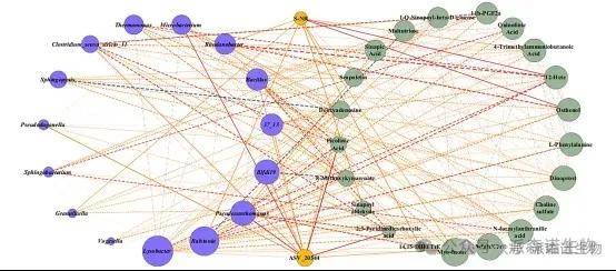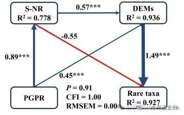 DEMs与关键细菌属、ASV_20544丰度以及S-NR之间相关性分析发现关键属中的Lysobacter显示出最大的连接度,并与大多数DEMs显著相关(图5)。结构方程模型(SEM)进一步解释了这四个因素之间的关系(图6):菌株在根际的定殖刺激了S-NR活性的增加,进而改变了根际的代谢特征,推动了关键类群的富集。