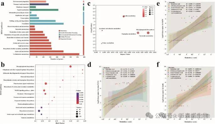 菌株NCT-2接种后,153种代谢物发生了显著变化,其中114种代谢物显著上调。差异表达代谢物(DEMs)KEGG通路富集分析发现,五条通路在菌株NCT-2接种下显著上调,包括色氨酸代谢、花生四烯酸代谢、苯丙素生物合成等(图4e)。