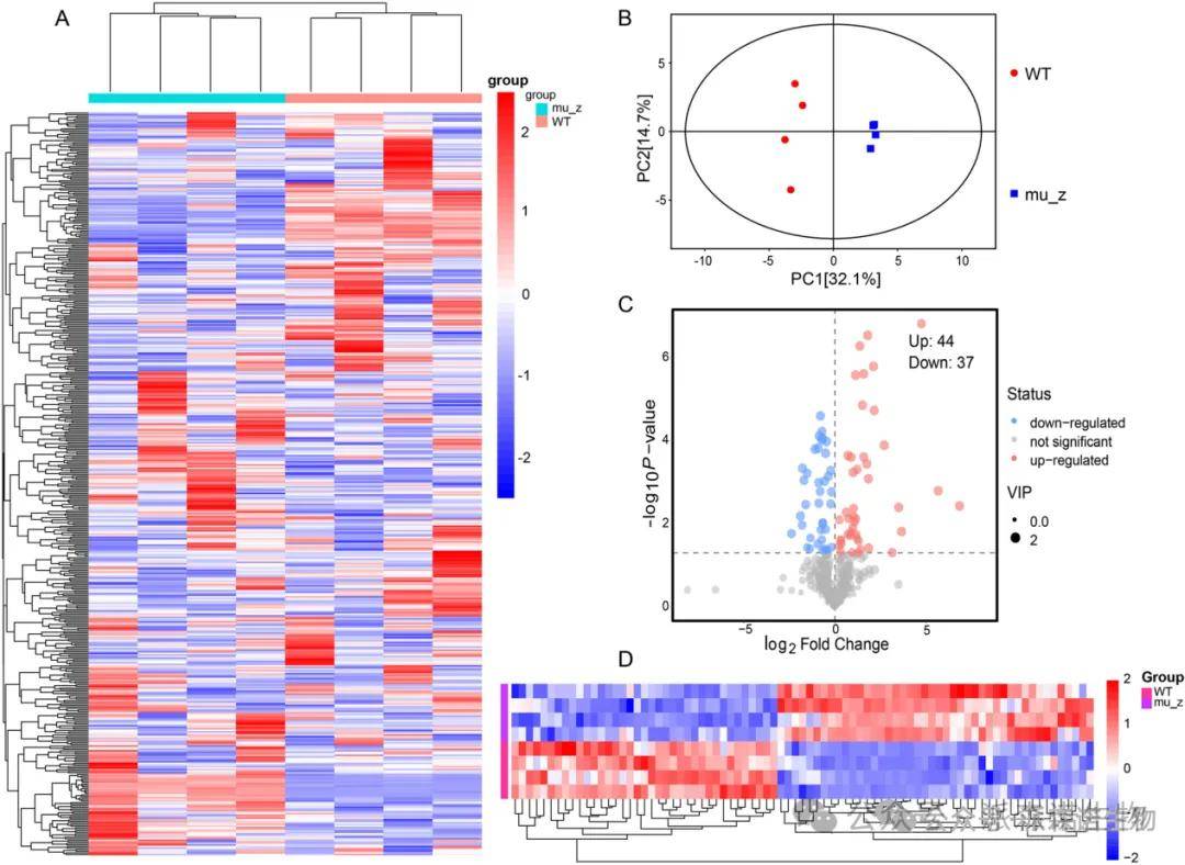 通过LC-MS技术分别对WT和mu_Z植株进行代谢组学分析(n=4),共检测到1018种代谢物。聚类热图和主成分分析(PCA)结果显示WT与mu_Z组样本聚类良好。与WT相比,mu_Z植株中共鉴定出81种差异代谢物(DEMs)。其中44种呈现显著上调趋势,而37种则显著下调。
