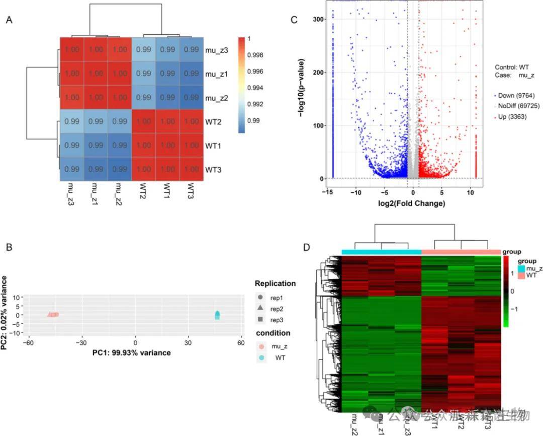 对WT与mu_Z植株进行转录组学分析(n=3),共鉴定出83512个基因。相关性和PCA分析表明样本组内重复性良好,证实转录组数据具有高可靠性。根据|log2FC|>1且P<0.05的标准筛选差异表达基因,共鉴定到13127个差异表达基因(DEGs),其中3363个上调,9764个下调。聚类分析显示,WT和mu_Z菌株之间的差异表达基因具有不同的聚类模式和相反的表达谱。