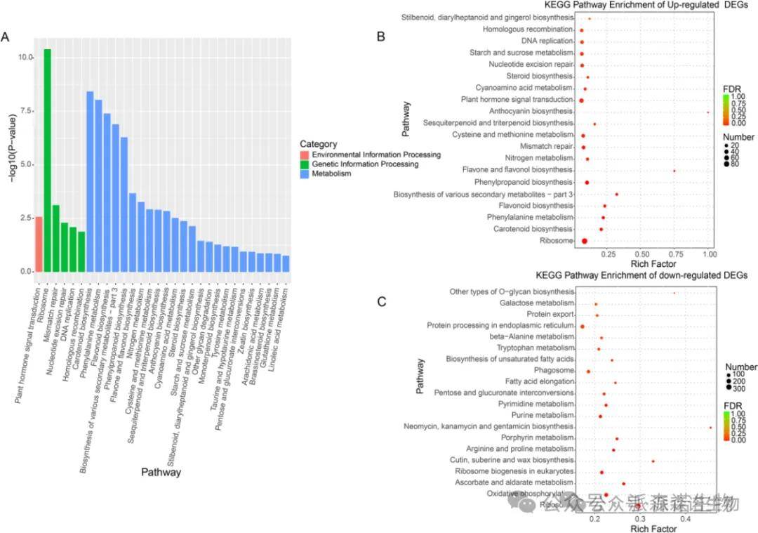 对DEGs进行注释及富集分析。苯丙氨酸代谢、黄酮类化合物生物合成、苯丙烷类化合物生物合成、黄酮醇与黄酮类化合物生物合成以及花青素生物合成等通路均呈现显著富集现象。KEGG富集分析显示,上调基因在花青素相关通路中富集程度更高。结果表明,紫色叶片的形成与花青素相关通路存在密切关联。