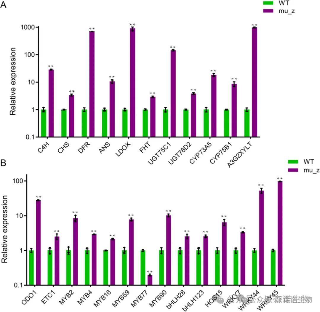 相较于WT,与花青素合成相关结构基因(C4H、CHS、DFR、ANS、LDOX和FHT),与成熟花青素生物合成和修饰相关基因(UGT75C1、UGT78D2、CYP73A5、CYP75B1和A3G2XYLT)以及花青素生物合成途径的关键调控因子(MYB、bHLH、WD40和大部分WRKY家族成员)在mu_Z中显著高表达。验证结果和RNA-seq结果一致。