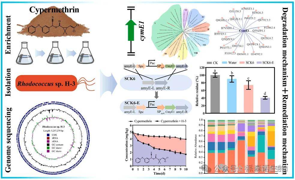 本研究通过长期富集培养与系统筛选,成功分离获得一株高效氯氰菊酯降解菌株Rhodococcus sp. H‑3。通过比较基因组学与分子生物学手段,系统阐明了该菌株的降解特性与代谢途径,并鉴定出一个新型水解酶基因cymE1,其编码的CymE1蛋白在氯氰菊酯水解过程中发挥关键作用。进一步采用分泌表达策略,通过基因组整合成功构建了高效分泌CymE1的工程菌株,显著提升了其对氯氰菊酯残留的去除效率。在土壤修复应用中,通过16S rRNA多样性分析发现,接种菌株H‑3不仅能有效降解土壤中残留的氯氰菊酯,还能显著改善土壤微生态环境,促进细菌群落结构的恢复与稳定。本研究从基因到生态系统层面系统揭示了拟除虫菊酯的生物降解机制,为农药污染的生物修复提供了重要的理论依据和具有应用潜力的微生物资源。