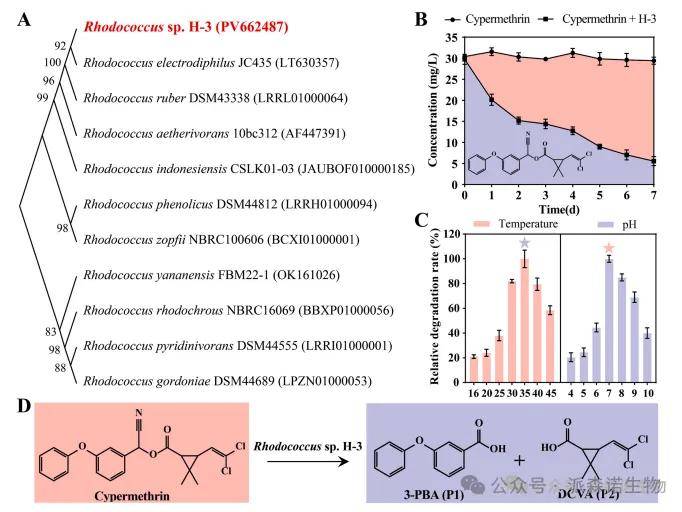 基于连续传代富集培养技术,成功分离筛选出一株高效氯氰菊酯降解菌——Rhodococcus sp. H‑3。该菌株在7天内对30 mg/L氯氰菊酯的降解率可达83.48%,展现出显著的降解能力。通过高效液相色谱-质谱联用技术分析,明确了该菌株通过断裂氯氰菊酯分子中的酯键,将其水解为3‑PBA和DCVA两种代谢产物的降解途径。进一步优化其降解条件发现,菌株H‑3在35°C、pH 7.0的中性环境中降解活性最高,这一特性为其在实际环境中的应用提供了重要依据。