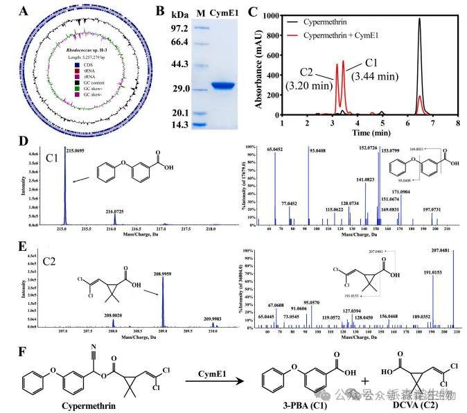 H3菌株的基因组全长5,257,279 bp,共预测到4908个基因。本研究成功从H3菌株中克隆并验证了一个酯酶基因orf3684,该基因被证实具有氯氰菊酯降解功能,命名为CymE1。系统发育分析显示,CymE1与已知酯酶的最高氨基酸序列相似性仅为33.50%,表明其为一种新型降解酶。纯化后的CymE1蛋白分子量约为32.0 kDa,与理论预测值相符。HPLC分析表明,CymE1降解氯氰菊酯后在3.20分钟和3.44分钟处出现特征性新峰,进一步通过LCMS/MS鉴定其降解产物分别为m/z 208.9959(DCVA)和m/z 215.0695(3PBA)。综上所述,CymE1可通过水解氯氰菊酯的酯键,将其分解为3PBA与DCVA。另外,H3菌株的氯氰菊酯降解代谢途径与报道的菌株一致,这一发现进一步支持了cymE1 是H3菌株中一个重要的氯氰菊酯降解基因的假设。然而,仍需进一步研究以确定其是否是唯一的降解基因。
