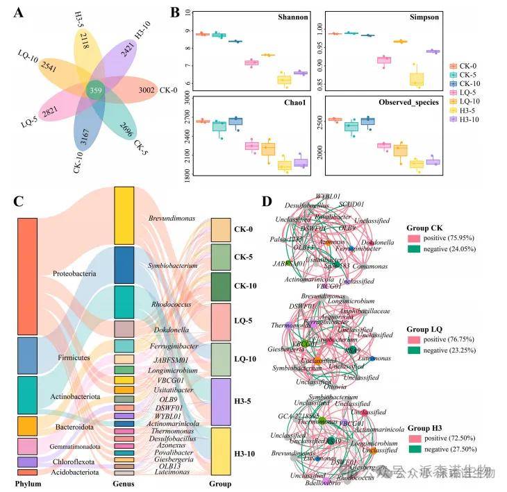 评估了H-3菌株对氯氰菊酯污染土壤的修复潜力,结果表明接菌10天后土壤中氯氰菊酯含量从5 mg/kg降至1.71 mg/kg,降解率达65.80%,且降解过程伴随明显的毒性降低。16S rRNA多样性分析显示,H-3菌株的引入可有效恢复土壤细菌群落的多样性和结构,显著提升放线菌门与厚壁菌门等有益菌群的相对丰度。属水平上,布氏菌属与共生菌属等具有代谢氯氰菊酯及其产物3-PBA能力的菌群显著富集。网络分析进一步表明,红球菌属与微菌属等多个类群存在协同互作关系。本研究证实H-3菌株不仅能高效降解氯氰菊酯,还可通过调控土壤微生物群落结构增强生态系统的自我修复能力。
