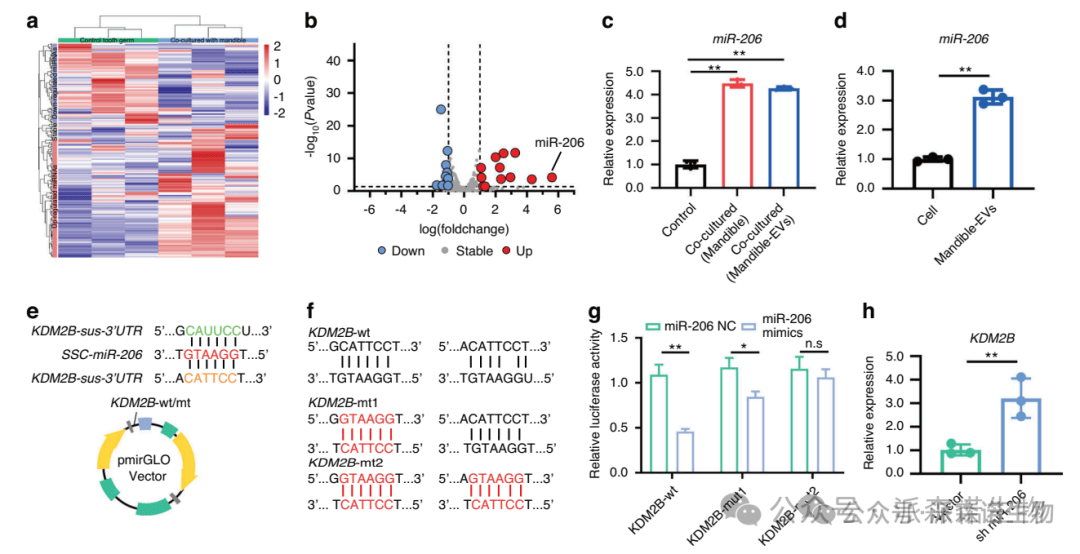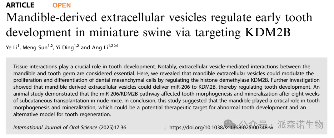 该研究利用小型猪模型通过体内外实验首次揭示了Mandible-EVs通过miR-206/KDM2B通路调控牙齿早期发育的表观遗传机制。这些发现不仅阐明了颌骨在牙齿形成中的调控作用,为预防和治疗牙齿发育异常提供新思路,更为牙齿再生技术创新策略的开发奠定理论基础。