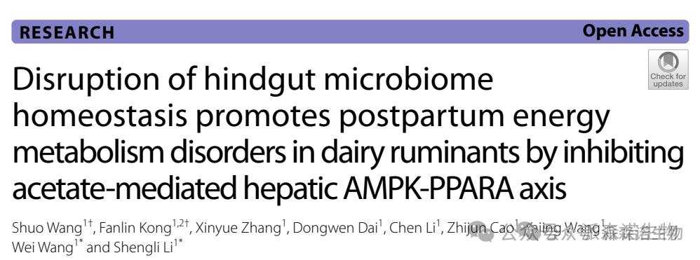 中文题目:后肠微生物组稳态破坏通过抑制乙酸介导的肝脏AMPK-PPARA轴促进反刍动物产后能量代谢紊乱