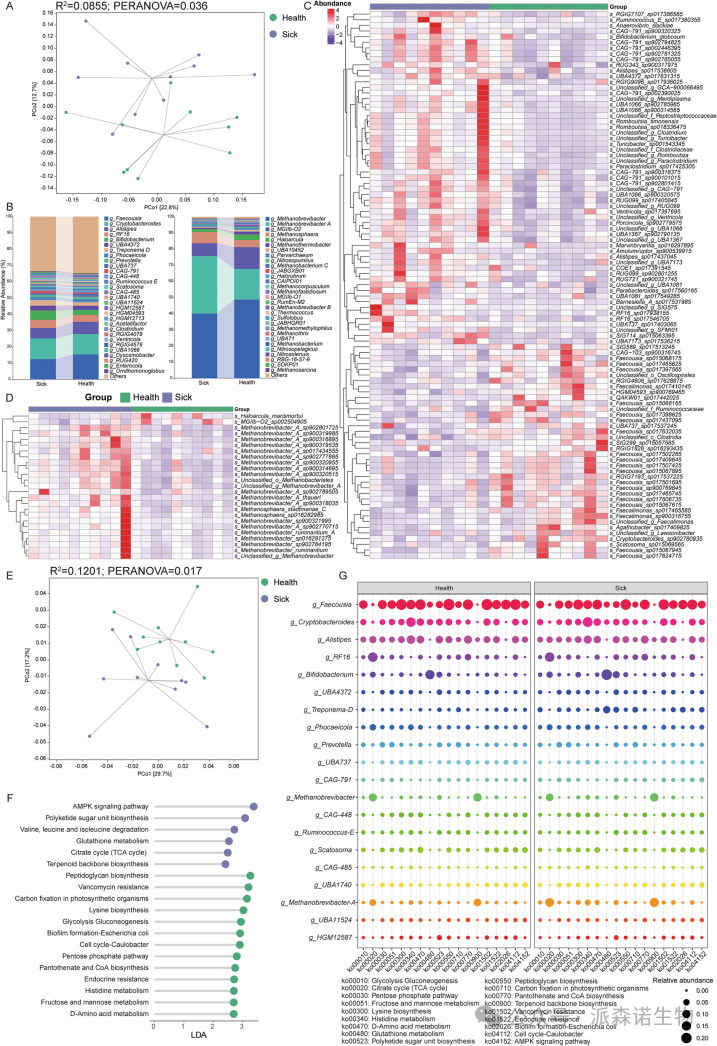 对产后21天后肠微生物群进行的宏基因组学分析结果,与16S rRNA基因测序结果表现出高度一致性。这不仅体现在两组间显著的β-多样性差异和香农指数的一致趋势上(图3A和图S1a),也体现在微生物群组成上(图3B)。在菌属水平,宏基因组结果同样揭示了两组在 Faecousia、Alistipes和 双歧杆菌属等菌属上的差异。值得注意的是,健康组与患病组在古菌组成上存在显著差异(图S1b)。在丰度前五的古菌中,健康组的甲烷短杆菌属、MGIIb-O2和盐盒菌属丰度较高,而患病组中甲烷短杆菌A和甲烷球形菌属的丰度最高。此外,差异物种分析显示,某些Faecousia菌种在健康组中更为丰富,而Romboutsia、甲烷短杆菌A和甲烷球形菌属的菌株在患病组中更为丰富(图3C和D)。在功能水平上,也发现两组在β-多样性方面存在明显分离(图3E)。Lefse分析表明,健康组中微生物代谢通路如赖氨酸生物合成、糖酵解/糖异生、磷酸戊糖途径、组氨酸代谢以及果糖和甘露糖代谢等上调;而患病组中AMPK信号通路、谷胱甘肽代谢以及柠檬酸循环/TCA循环等通路上调(图3F)。通过比较丰度前20的菌属对这些差异功能的贡献,确定Faecousia是健康组中上调通路的关键贡献者,而甲烷短杆菌A和双歧杆菌属是患病组中上调通路的关键贡献者(图3G)。