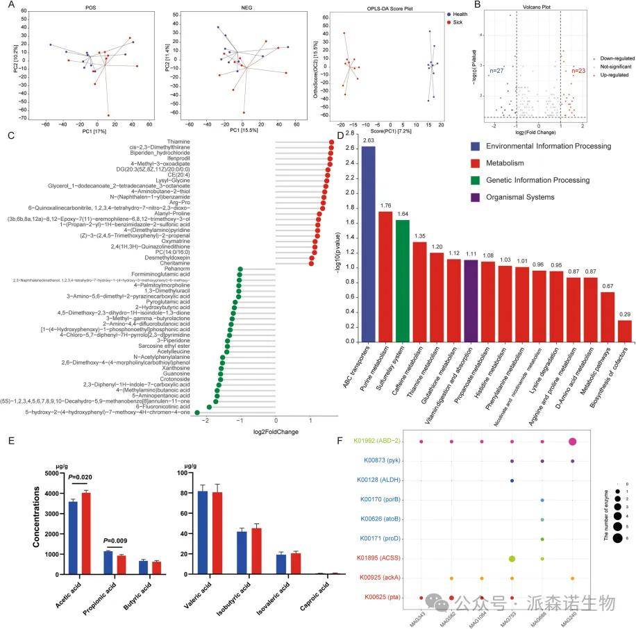 非靶向代谢组学分析显示,在正、负离子模式下,患病组与健康组的粪便代谢谱均存在显著分离。患病组中有23种代谢物显著上调,27种代谢物显著下调(图5B)。具体而言,硫胺素、4-甲基-3-氧代己二酸、二酰甘油(DG(20:3(5Z,8Z,11Z)/20:0/0:0))及胆固醇酯(CE(20:4))等代谢物在患病组中显著上调;而亚胺甲基谷氨酸、1,3-二甲基尿嘧啶、焦谷氨酸和2-羟基丁酸等代谢物则在健康组中显著上调(图5C)。KEGG富集分析表明,涉及谷胱甘肽、组氨酸和赖氨酸代谢的通路显著富集(图5D),这揭示了宏基因组学与代谢组学数据间的强相关性,并提示这些差异代谢物受微生物驱动调控。在靶向短链脂肪酸分析中,健康组的乙酸水平显著较高,而患病组的丙酸水平显著较高(图5E)。进一步分析发现,MAG343、MAG582、MAG1084和MAG753含有与乙酸合成及代谢相关的关键酶,但缺乏丙酸代谢的关键酶;反之,MAG688和MAG240则不含有如pta等关键的乙酸合成酶(图5F)。此外,MAG688富集了ACSS等乙酸代谢酶,而MAG240则未富集此类酶(图5F)。