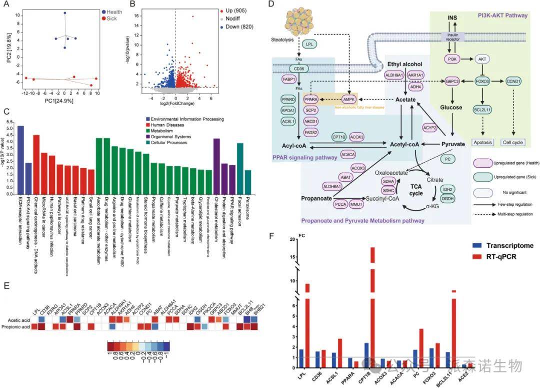 肝脏转录组学的主成分分析显示,健康组与患病组之间存在明显分离(图6A)。共鉴定出905个显著上调基因和820个显著下调基因(患病组/健康组)(图6B)。KEGG富集分析显示,PI3K-AKT信号通路、谷胱甘肽代谢、丙酸代谢、丙酮酸代谢及PPAR信号通路等通路显著富集(图6C)。对肝脏碳水化合物和脂代谢信号通路的深入分析表明,健康组奶牛肝脏中包括FABP1、PPARA、FADS2、ACOX3、AMPK、PI3KCA和G6PC3在内的关键基因表达上调;而患酮病奶牛肝脏中包括LPL、CD36、PPARD、APOA1、ACSL1、CPT1B、PC、FOXO3、CCND1和BCL2L11在内的关键基因表达上调(图6D)。此外,粪便中乙酸与丙酸水平与肝脏关键差异基因的表达以及血液β-羟基丁酸浓度之间存在强相关性(图6E)。